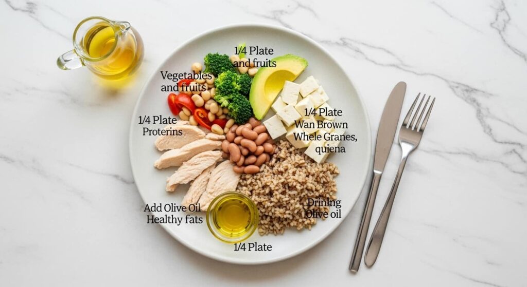 - ¼ Plate: Lean proteins (chicken, tofu, beans, fish)